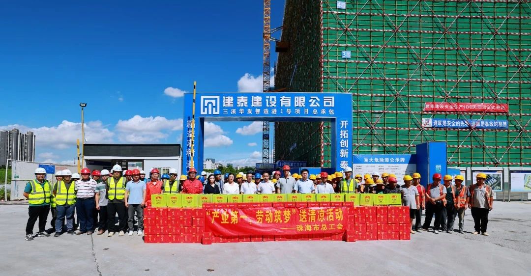 7月11日上午,珠海市總工會(huì)四級(jí)調(diào)研員張羅燦,市工人文化宮主任王春宇,華發(fā)集團(tuán)工會(huì)負(fù)責(zé)人、集團(tuán)首席品牌官蘇華,華發(fā)集團(tuán)工會(huì)副主席劉詩伽率隊(duì)將消暑飲品送到三溪·華發(fā)智造港1號(hào)項(xiàng)目施工現(xiàn)場并派發(fā)至每一位工人手中。